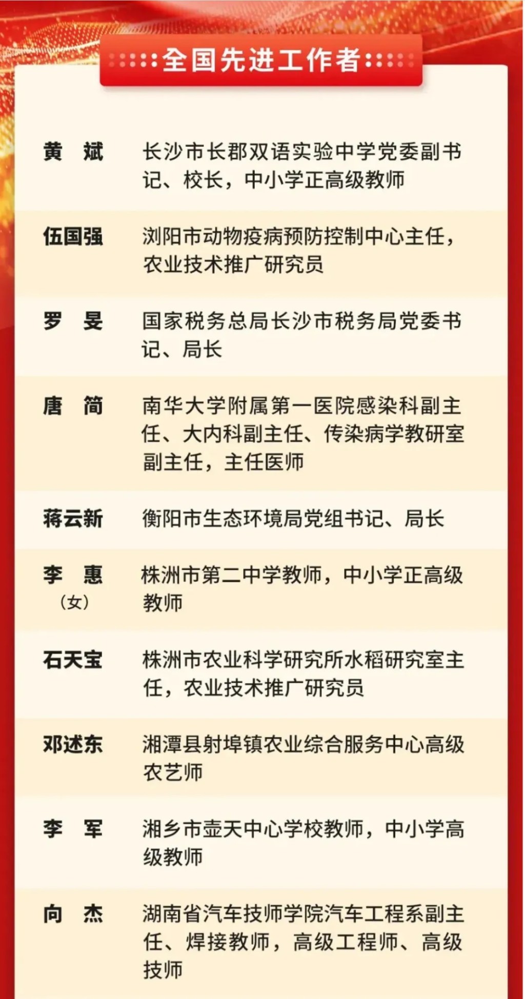 4月28日,慶祝中華全國總工會(huì )成立100周年暨全國勞動(dòng)模范和先進(jìn)工作者表彰大會(huì )在北京舉行。湖南省共有84位同志獲得全國勞動(dòng)模范和全國先進(jìn)工作者榮譽(yù)稱(chēng)號,其中,衡陽(yáng)市生態(tài)環(huán)境局黨組書(shū)記、局長(cháng)蔣云新榮獲全國先進(jìn)工作者表彰。