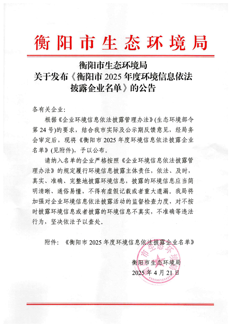 關(guān)于發(fā)布《衡陽(yáng)市2025年度環(huán)境信息依法披露企業(yè)名單》的公告