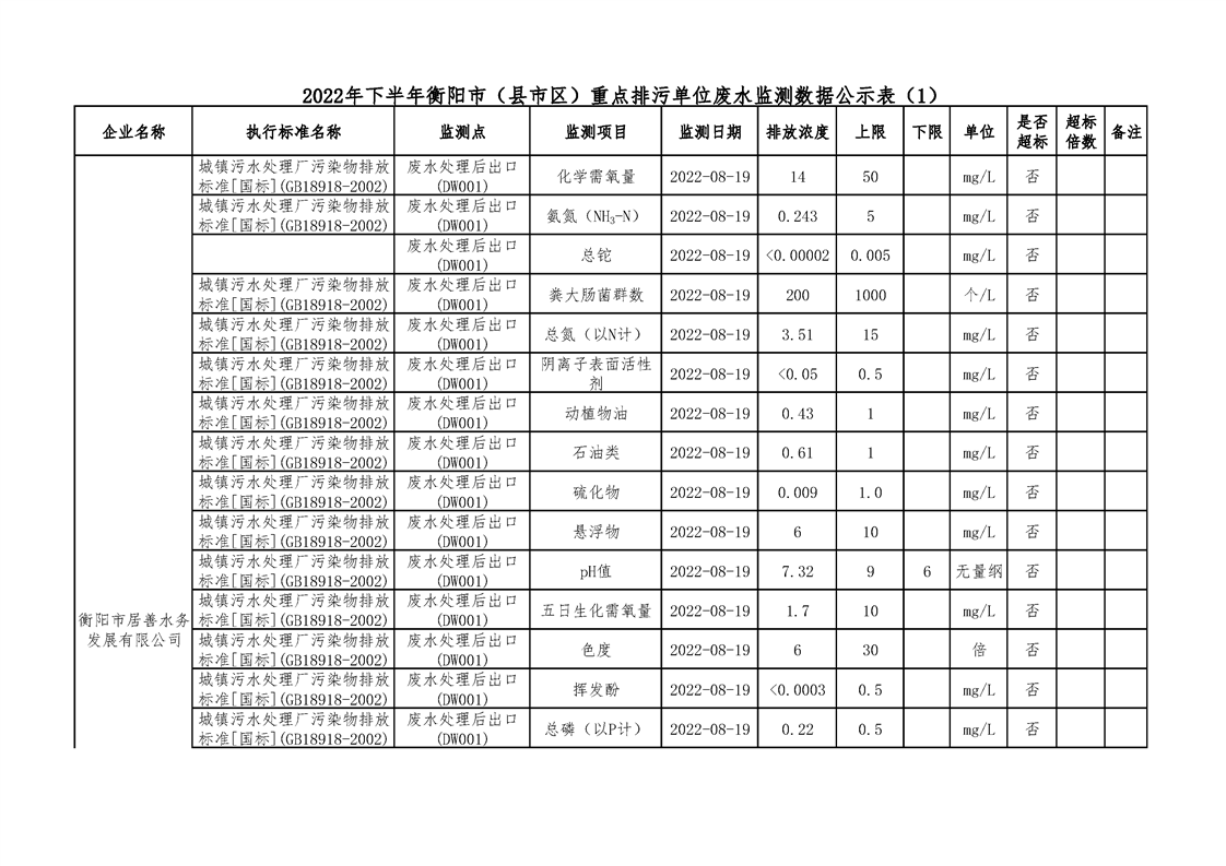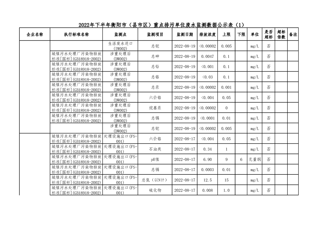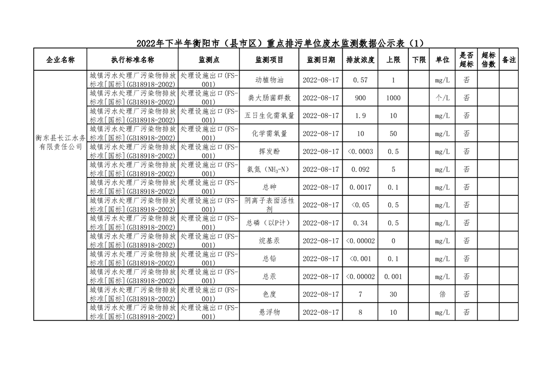 2022年下半年衡陽(yáng)市(縣市區(qū))重點(diǎn)排污單位廢水執(zhí)法監(jiān)測(cè)數(shù)據(jù)公示表(一)
